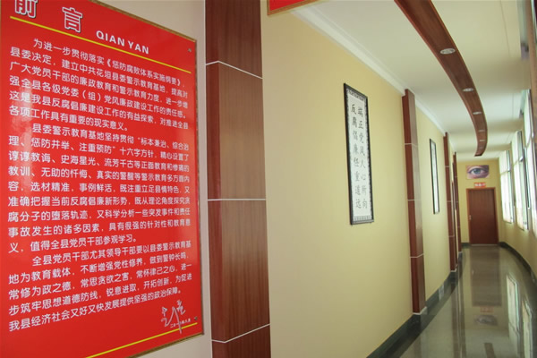 警示教育基地由“一廊三厅”构成,分别为“廉政文化长廊”、“预防厅”、“惩治厅”、“座谈厅”,面积150平方米,共分为长篇,同时,设有前言和结束语。